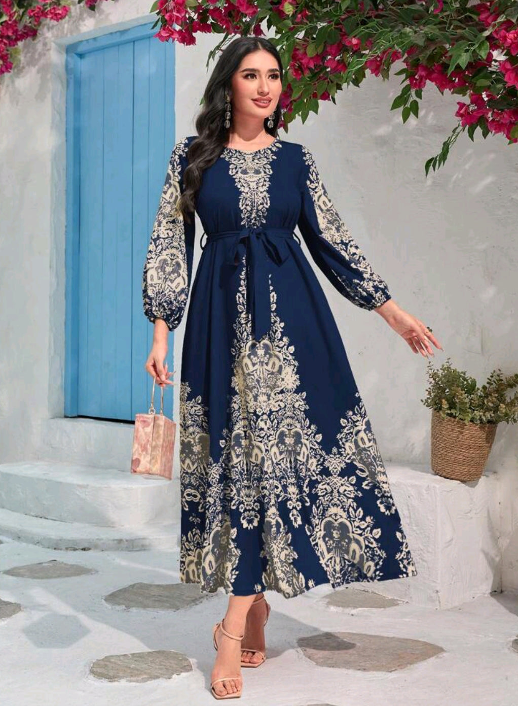 Al Najma Floral Print Lantern Sleeve Belted Dress Maxi Women Outfit