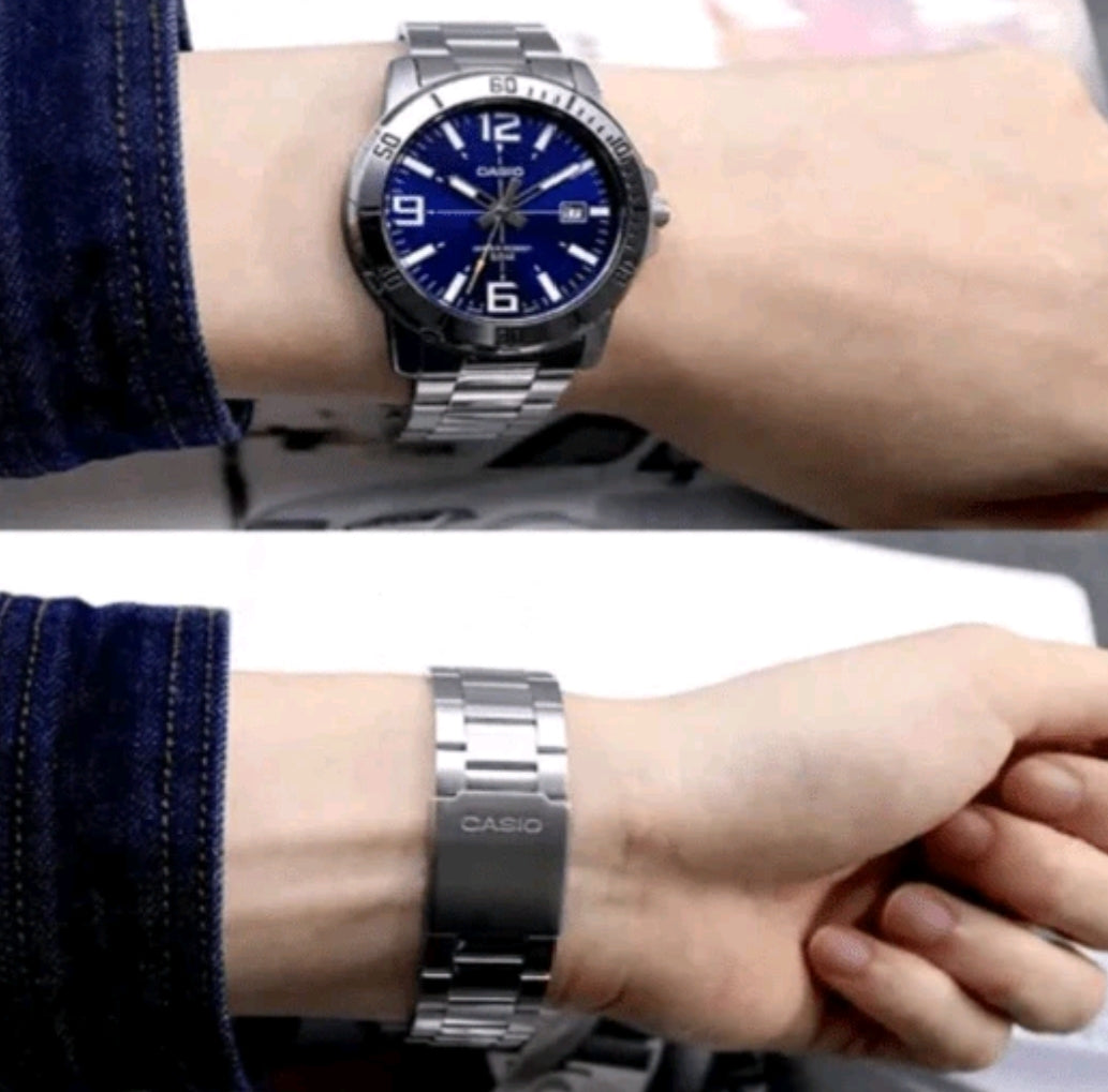 This Casio men's analog watch features a bold blue dial with luminous hands and markers for easy readability. Housed in a sleek silver stainless steel case with a matching bracelet, it offers water resistance up to 50 meters and includes a convenient date display at 3 o'clock. Perfect for everyday style with a sporty edge.