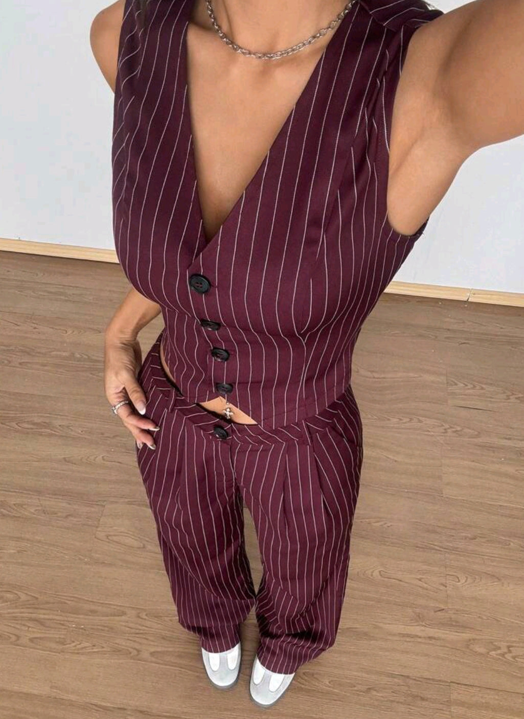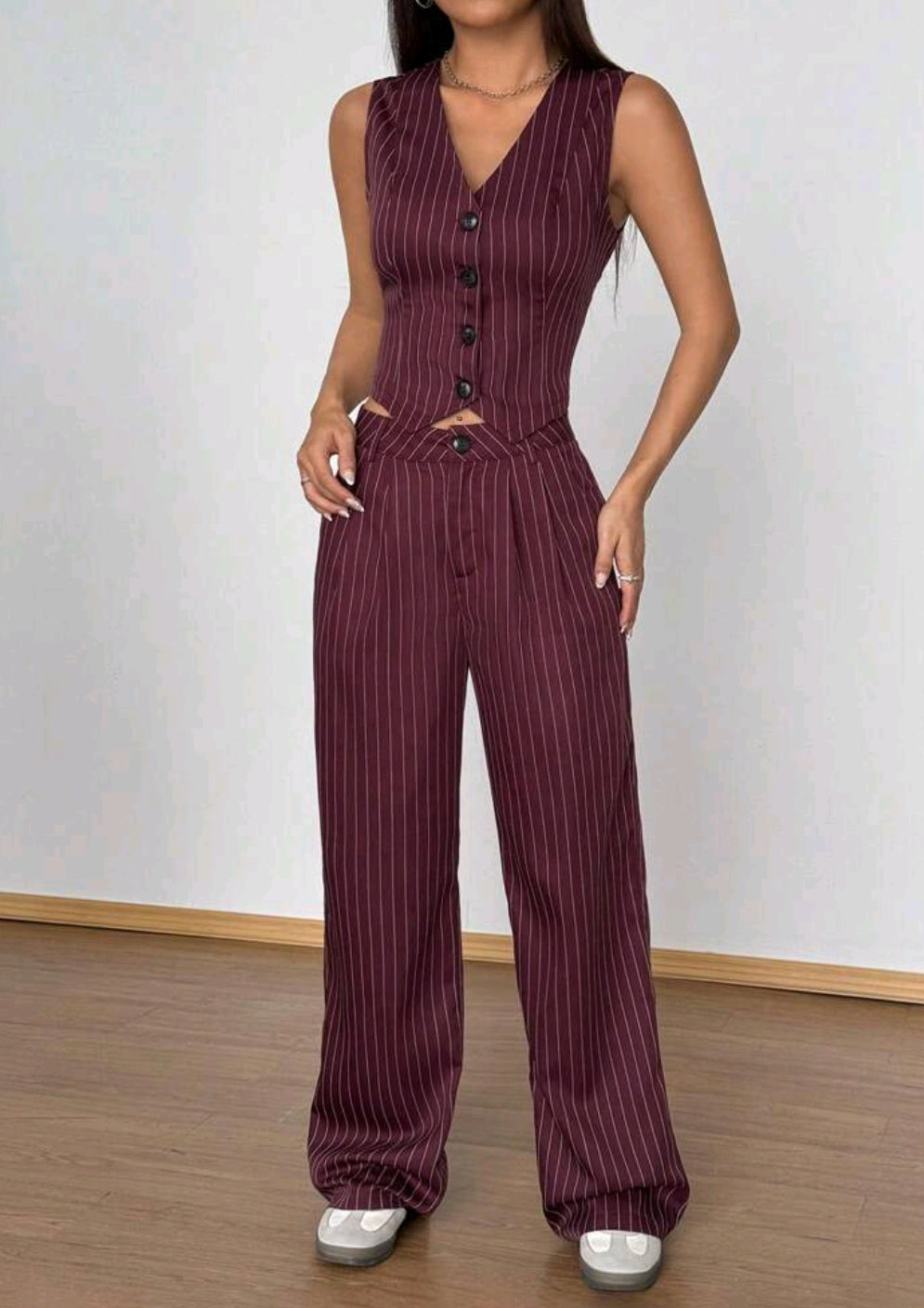Elevate your style with this chic maroon pinstripe two-piece set, featuring a tailored sleeveless button-down vest and matching high-waist trousers. Designed with a flattering fit and vertical stripes for a sleek, elongated silhouette, this outfit blends sophistication with modern edge—perfect for office wear, events, or a polished casual look.