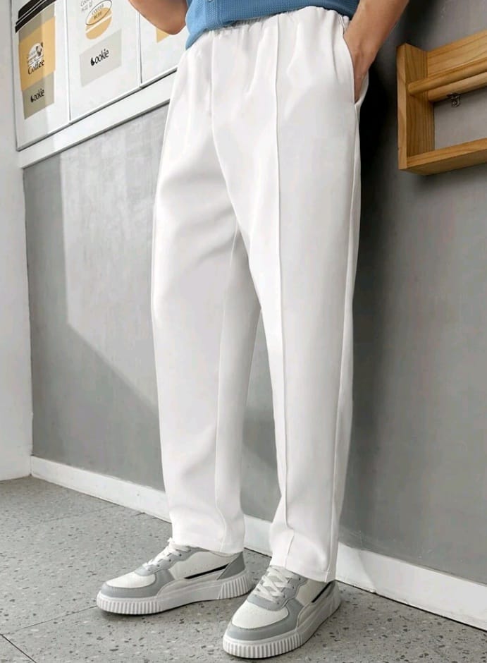 , modern style with a crisp white finish. They feature a straight-leg cut with front crease detailing for a polished look, along with an elastic waistband for comfort and ease of wear. Paired with light-toned sneakers, the pants strike a perfect balance between casual and smart, making them versatile for both relaxed outings and semi-formal occasions.
